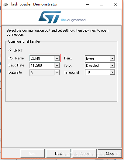 选择USB串口线的串口号,注意需要boot0 为1,boot1 为0(默认全是0)