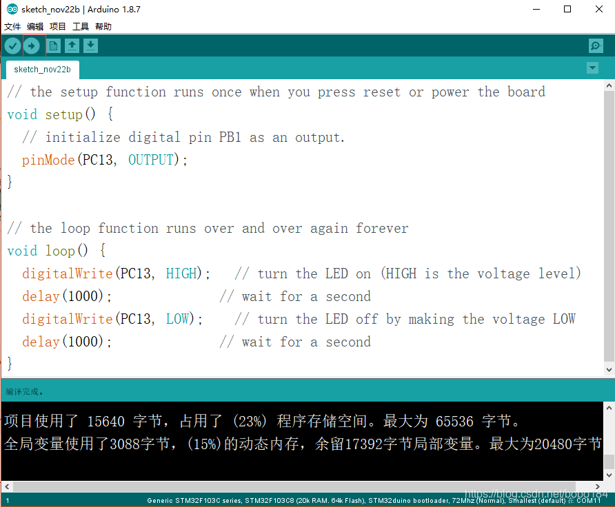 打开一个例程,LED闪烁的,例程里引脚为PB1,修改PC13(和板子对应,也可以不修改接一个LED即可)